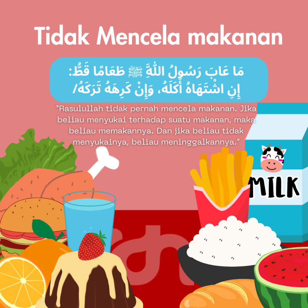 Rasulullah SAW menunjukkan sikap yang bijak dan penuh adab terhadap makanan. Beliau tidak pernah mencela atau mengkritik makanan yang disediakan. Jika beliau menyukai makanan tersebut, beliau akan memakannya, dan jika tidak menyukainya, beliau akan meninggalkannya tanpa mengungkapkan kata-kata yang buruk. Ini adalah contoh adab yang harus kita ikuti dalam kehidupan sehari-hari.