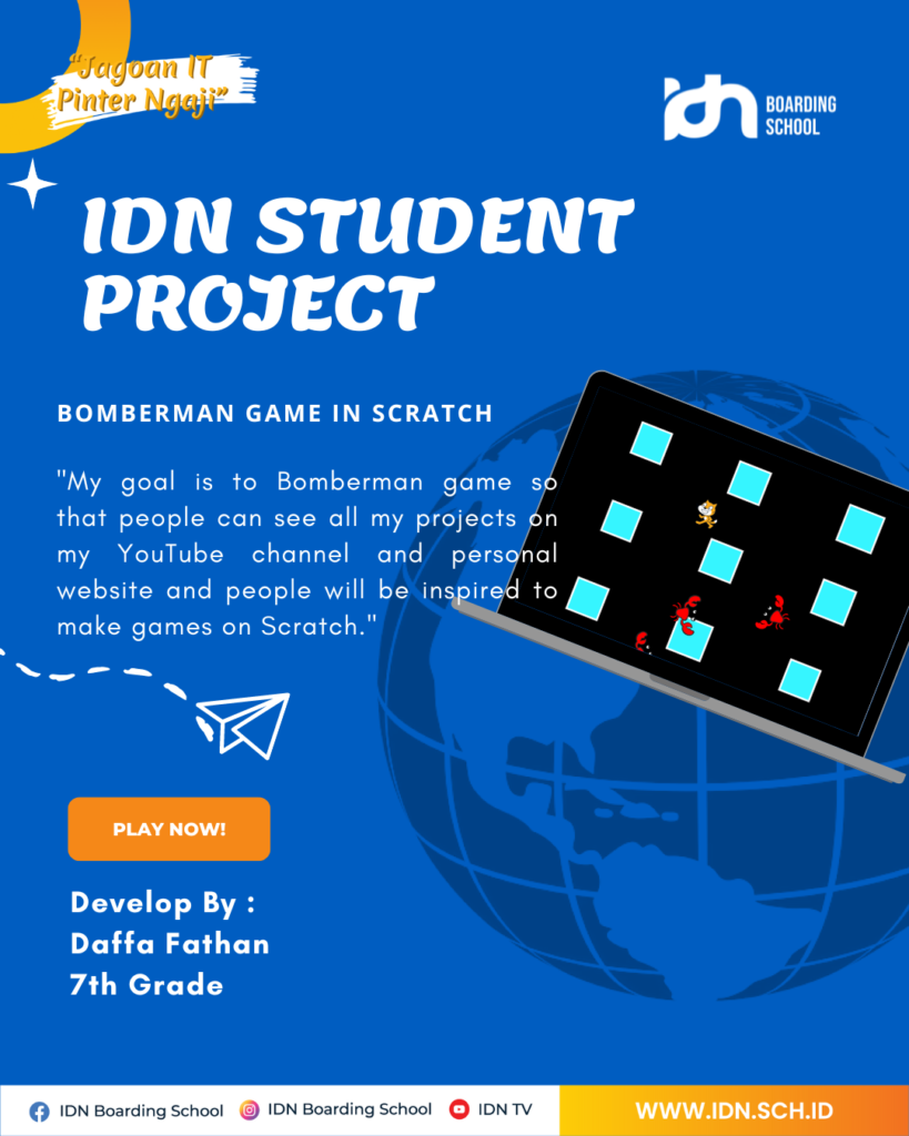 “Bomberman Game is like game to kill enemy but the players is cat and the enemy is crab we must kill the crab with bomb and the players dont untill get catch or die it will be lose. If the crab all is die we will win.”