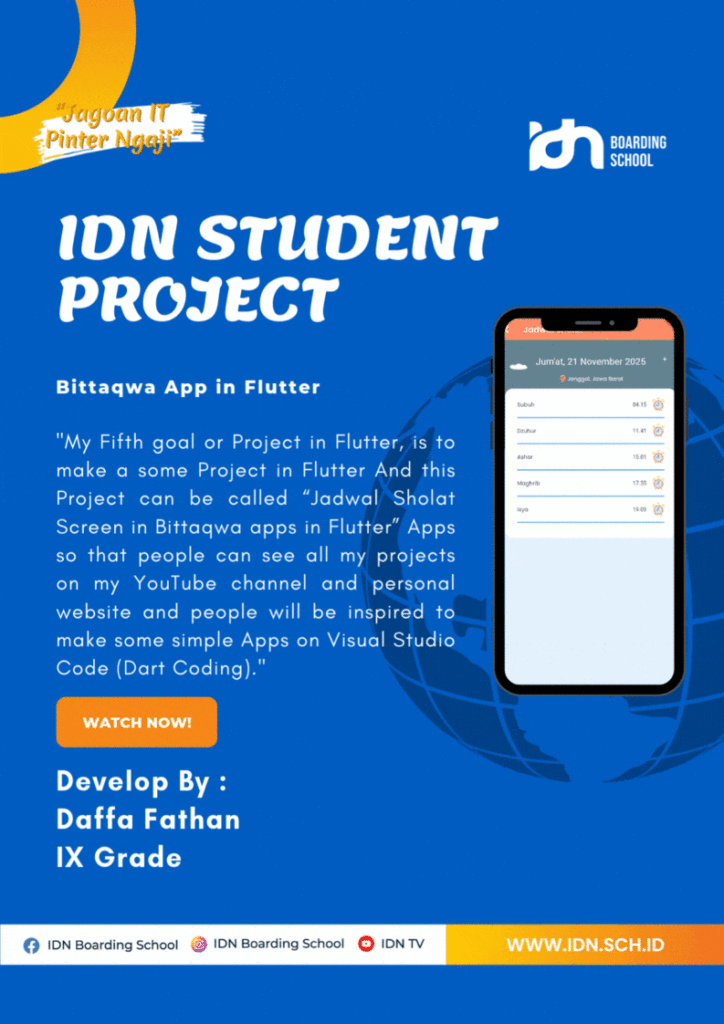 Technically, the project uses Flutter widgets, responsive layouts, and asynchronous API calls to fetch data from VPI. Every component is organized cleanly inside VS Code, following structured folders for screens, models, and services. The logic for reading prayer times is placed in a dedicated API service, ensuring clean architecture and easy future maintenance.